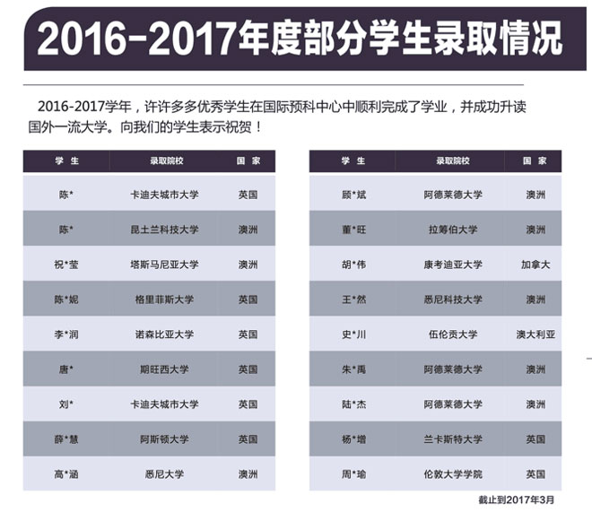 安徽师范大学卡迪夫国际预科中心2016-2017年度部分学生录取情况