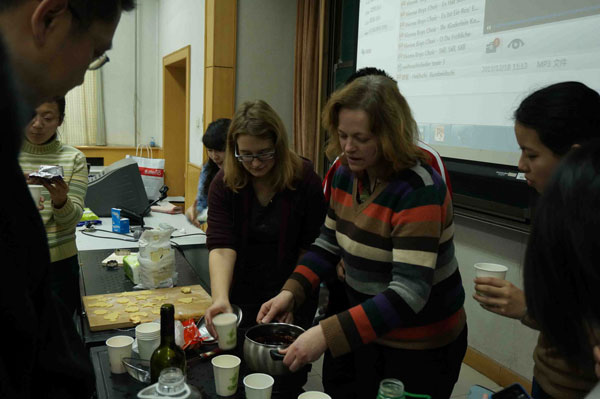 12月22日下午,一场气氛欢快的德语圣诞派对在北京语言大学培训学院外语部主北158教室隆重举行。德语外教Maria、Charlotte、中教佟文斌老师与德语秋季周末班的同学一起烘焙德式饼干、唱歌做游戏、煮制德国热酒等,师生共同庆祝圣诞节。期间佟文斌老师还为大家生动地讲解了德国圣诞习俗。学生们通过学烘焙、饮热酒、唱圣诞歌、做游戏,不仅度过一个欢乐的圣诞节,而且还充分的了解了德国文化。继此次圣诞派对之后,本周23日和25日晚,德语晚班的学生们也将享受到这样集视、听、味觉于一体的圣诞盛宴。